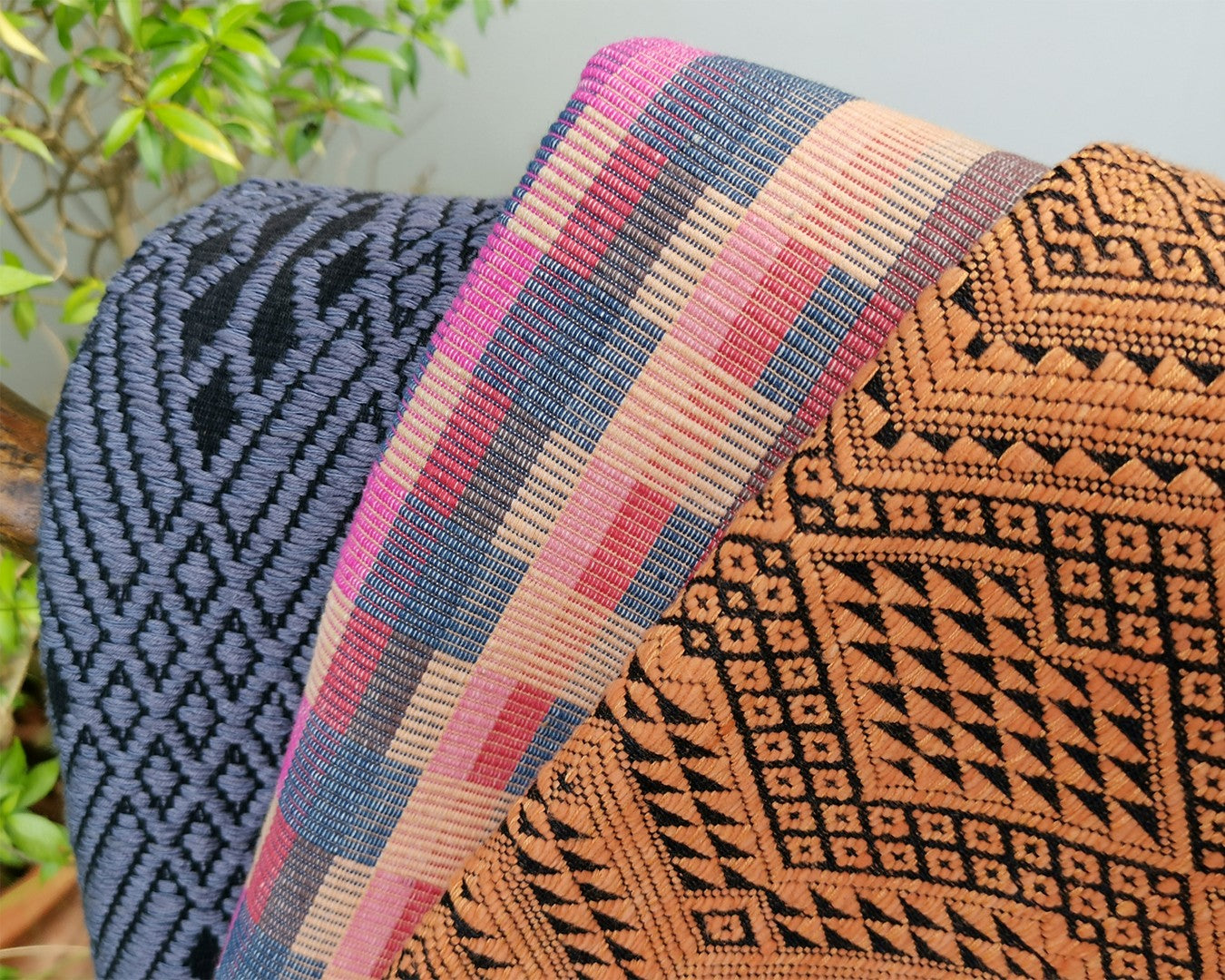 Handwoven textile composed of cotton and polyester. The motif is the reverse image of the chenille work found on the tunics of Pwo Karen un-married women in North-western Thailand.  Supplementary weft weaving has replaced the traditional chenille weaving technique.
