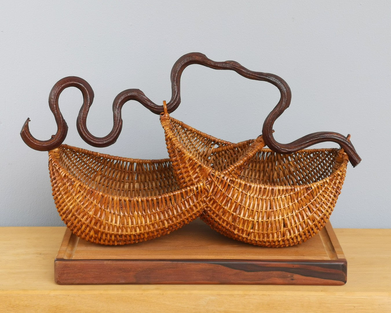 Unique handwoven basket made from rattan and monkey ladder vine. The inspiration for this basket comes from the shape of an elephant howdah.