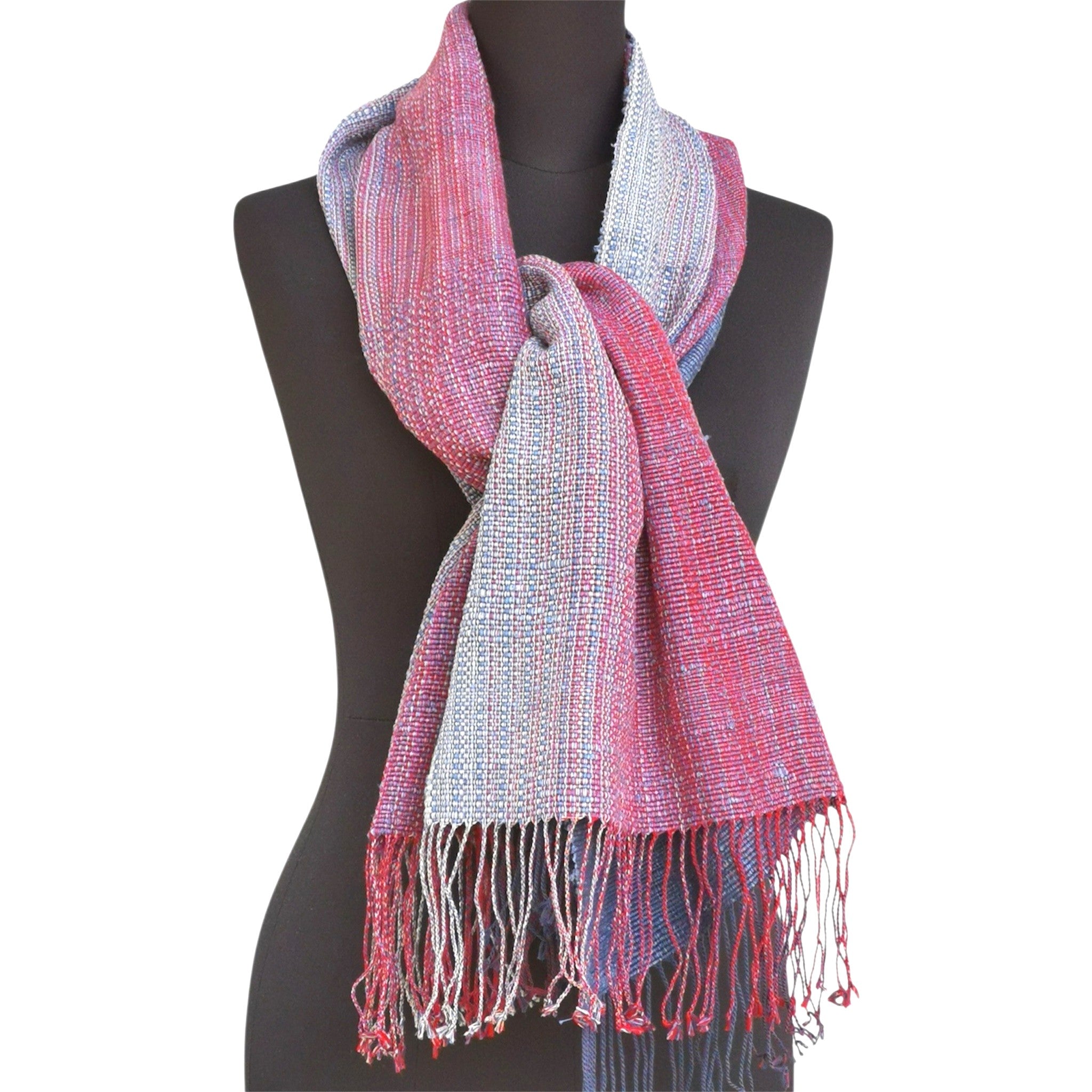 Luxurious, handwoven shawl composed of cotton and kibiso silk in a rich gradation of colours from navy, red, beige and cream.
